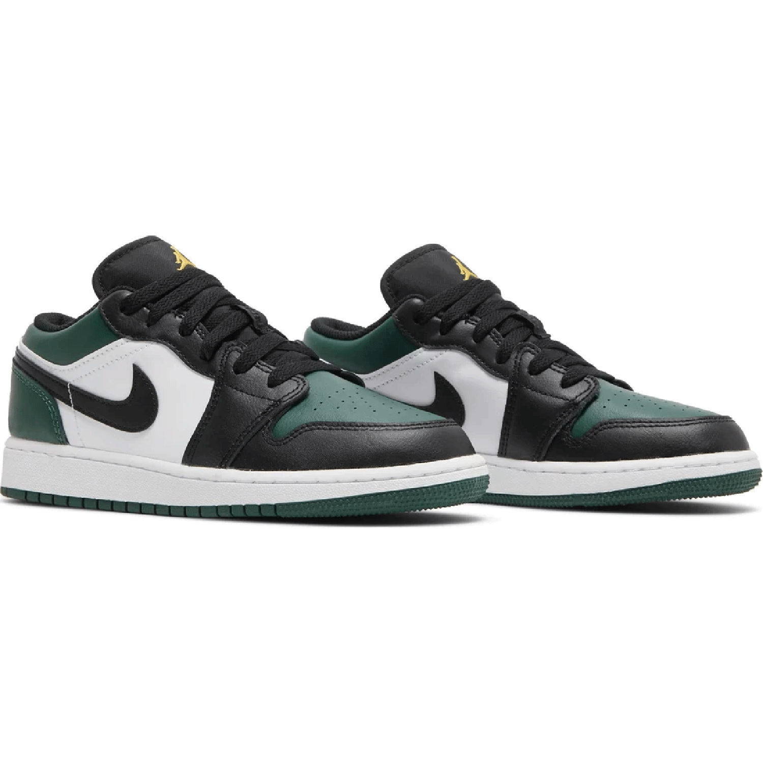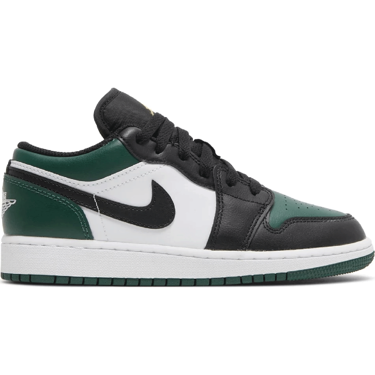 A bold update to a timeless silhouette, the Air Jordan 1 Low GS 'Green Toe' brings standout style to younger sneaker fans. Featuring a premium leather upper with rich green on the toe box, heel, and outsole—balanced by black and white panels—this colorway delivers strong visual contrast rooted in classic Jordan design.