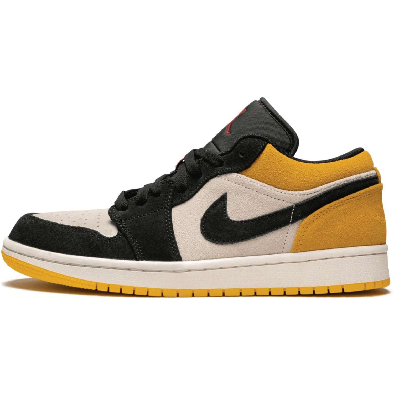 The Jordan 1 Low Sail 'University Gold Black' features a clean Sail leather upper with bold University Gold and Black accents. The low-top silhouette is complemented by signature Jordan branding, offering a stylish and versatile look.
