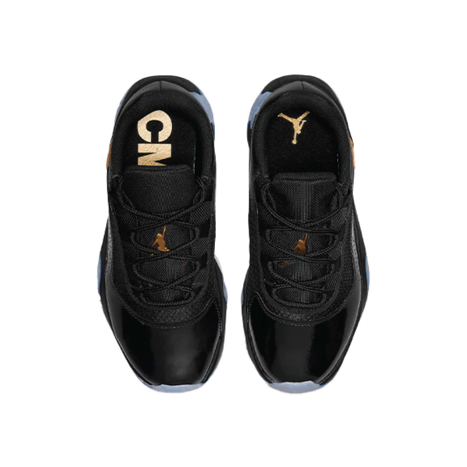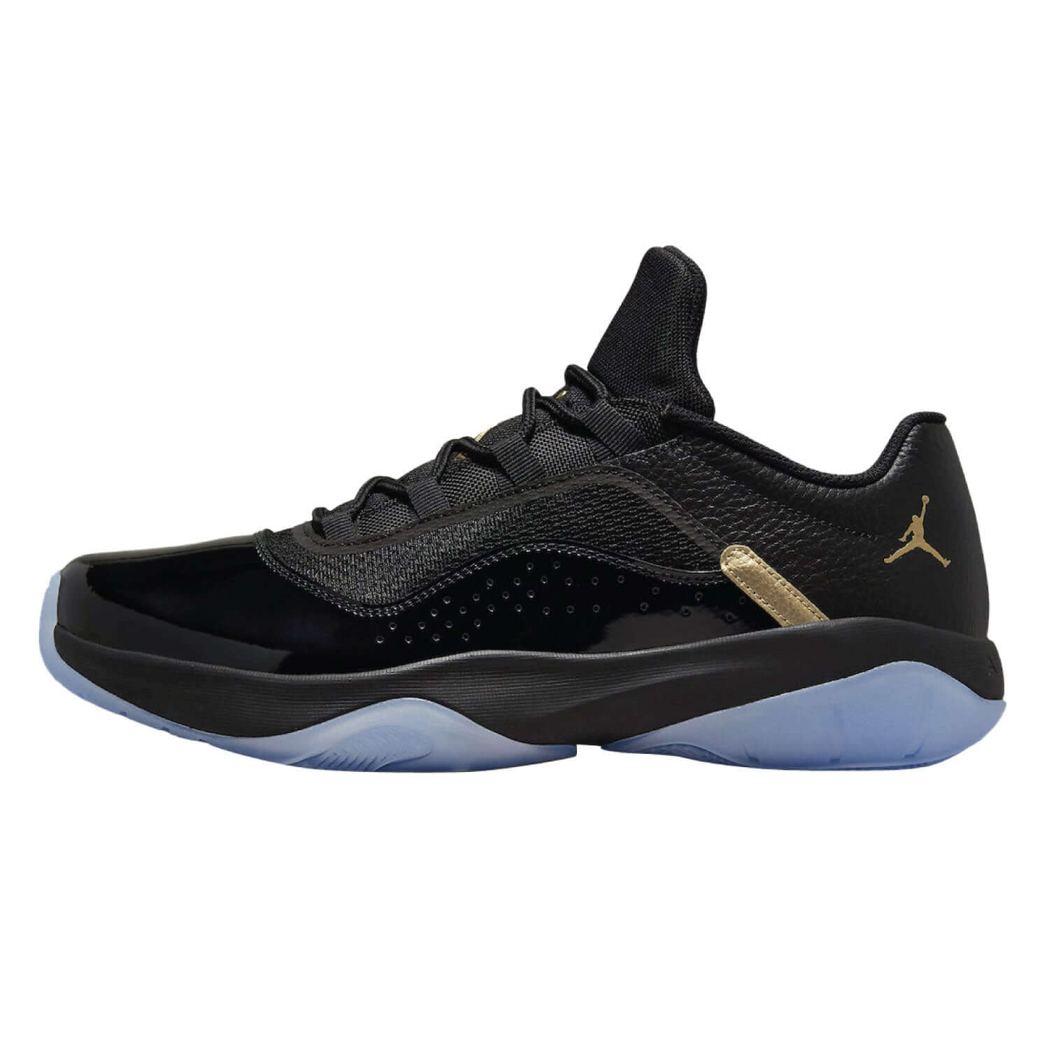 Turn heads everywhere you step in these men's Air 11 CMFT sneakers from Jordan. In a black colorway with an iced-out outsole, these low-top kicks have patent and synthetic leather as well as a textile mix through the upper for a lightweight yet durable feel. They have a padded ankle collar for a comfy fit, while webbing loops deliver a quick lacing system. Underfoot, a Cushlon foam midsole houses Zoom Air cushioning in the forefoot for an ultra-responsive ride, while the rubber outsole is split into sections for streamlined grip. These Ever Sole are finished off with Metallic Gold details, including Jumpman logos on the heel and tongue.