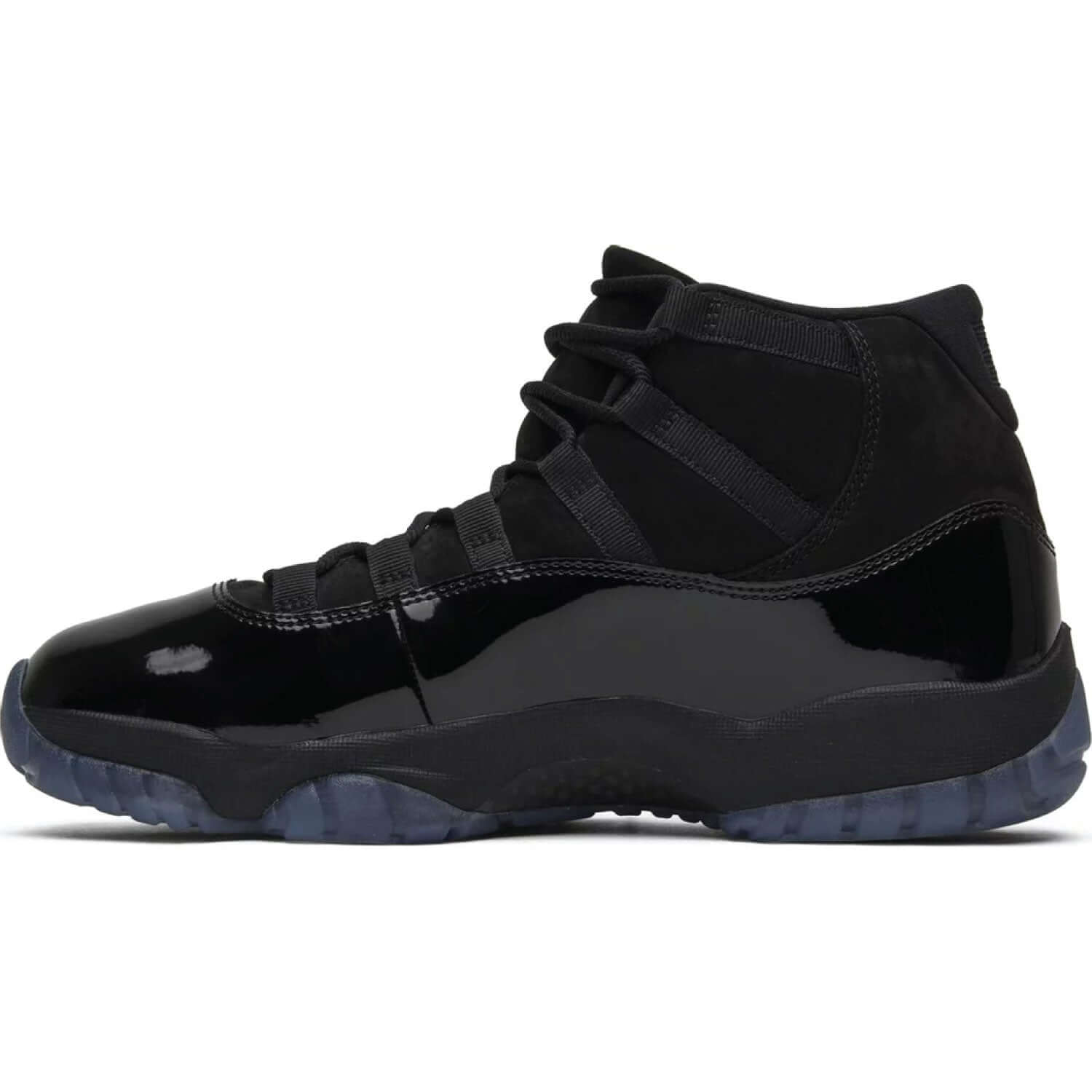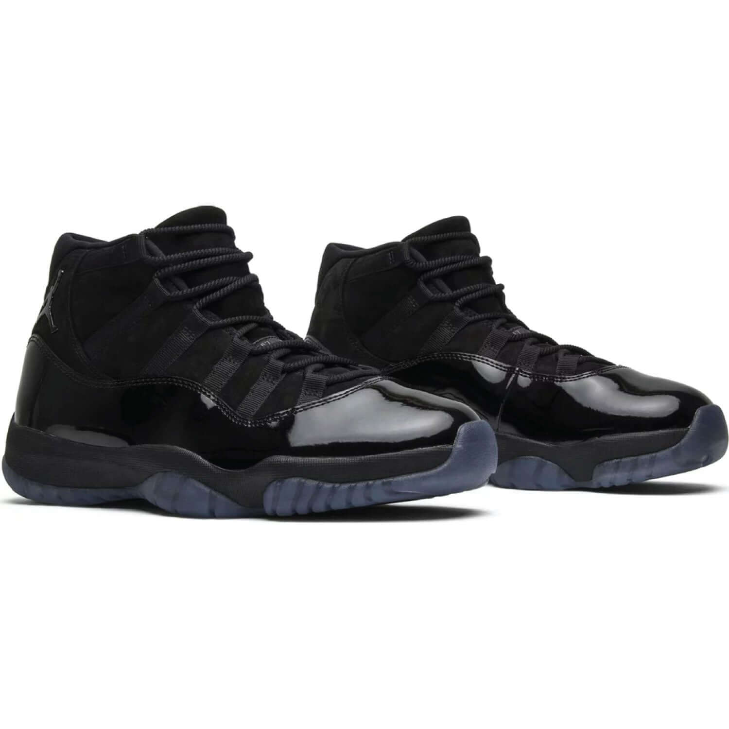 First teased in 2011 as a sample from the Air Jordan Blackout Collection, the Air Jordan 11 Retro 'Cap and Gown' was finally made available to the public in 2018. The name refers its formal look, designed to be worn for occasions such as graduation ceremonies—its laces are even inspired by graduation cords. The all-black model features a patent leather and premium nubuck upper atop an icy blue outsole.