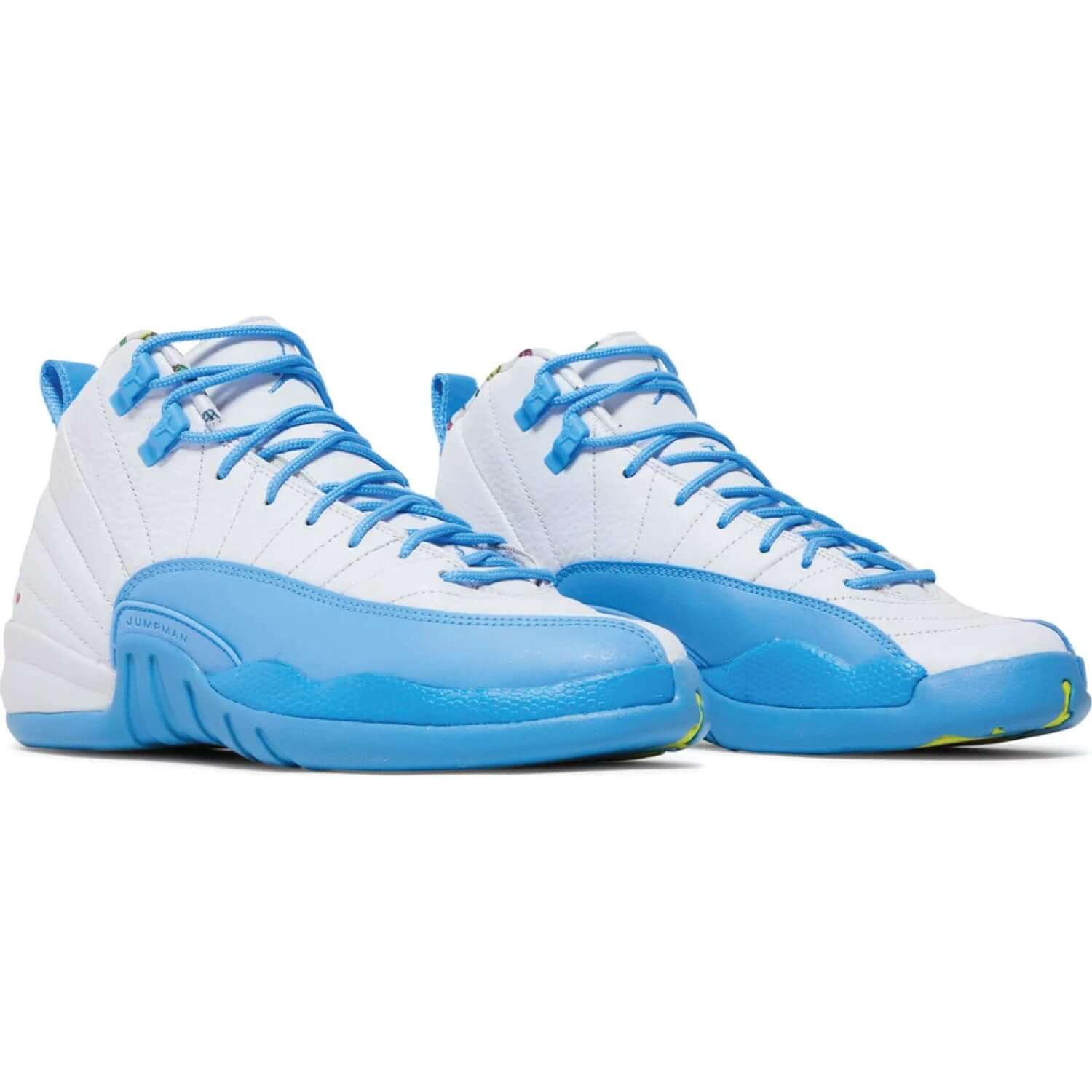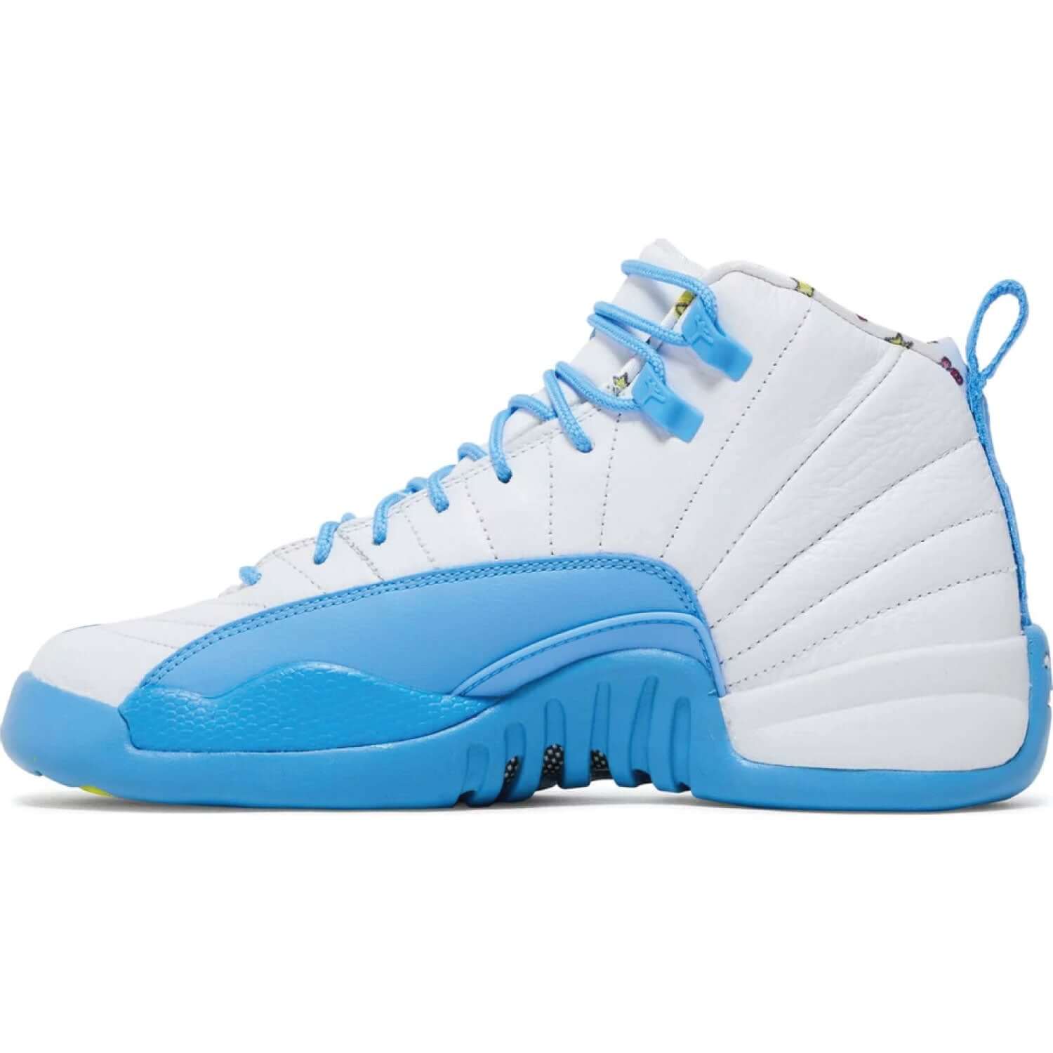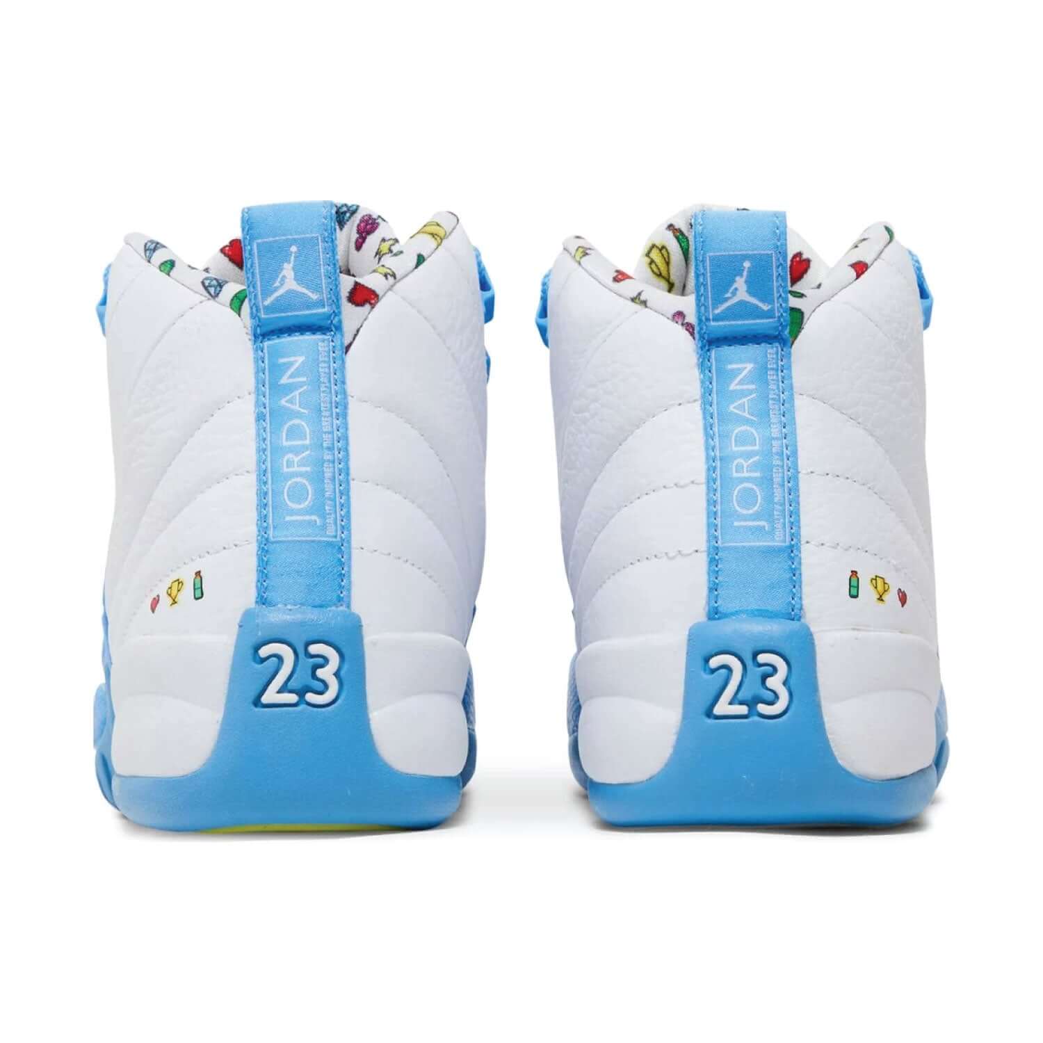 Built for big kids, the Air Jordan 12 Retro GS ‘Emoji’ combines unique details with a classic color scheme rooted in Jordan heritage. The 12’s signature stitched lines radiate outward on the white leather upper, bolstered with a synthetic leather mudguard in University Blue. Traditional Jumpman branding decorates the tongue, while assorted video game graphics appear on the lateral heel and textile collar lining. The sneaker rides on a lightweight Phylon midsole with encapsulated Air-sole cushioning in the heel.