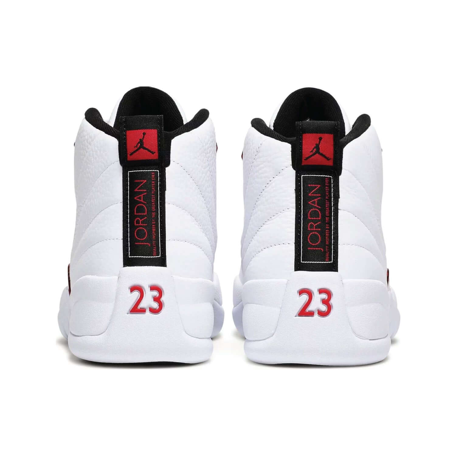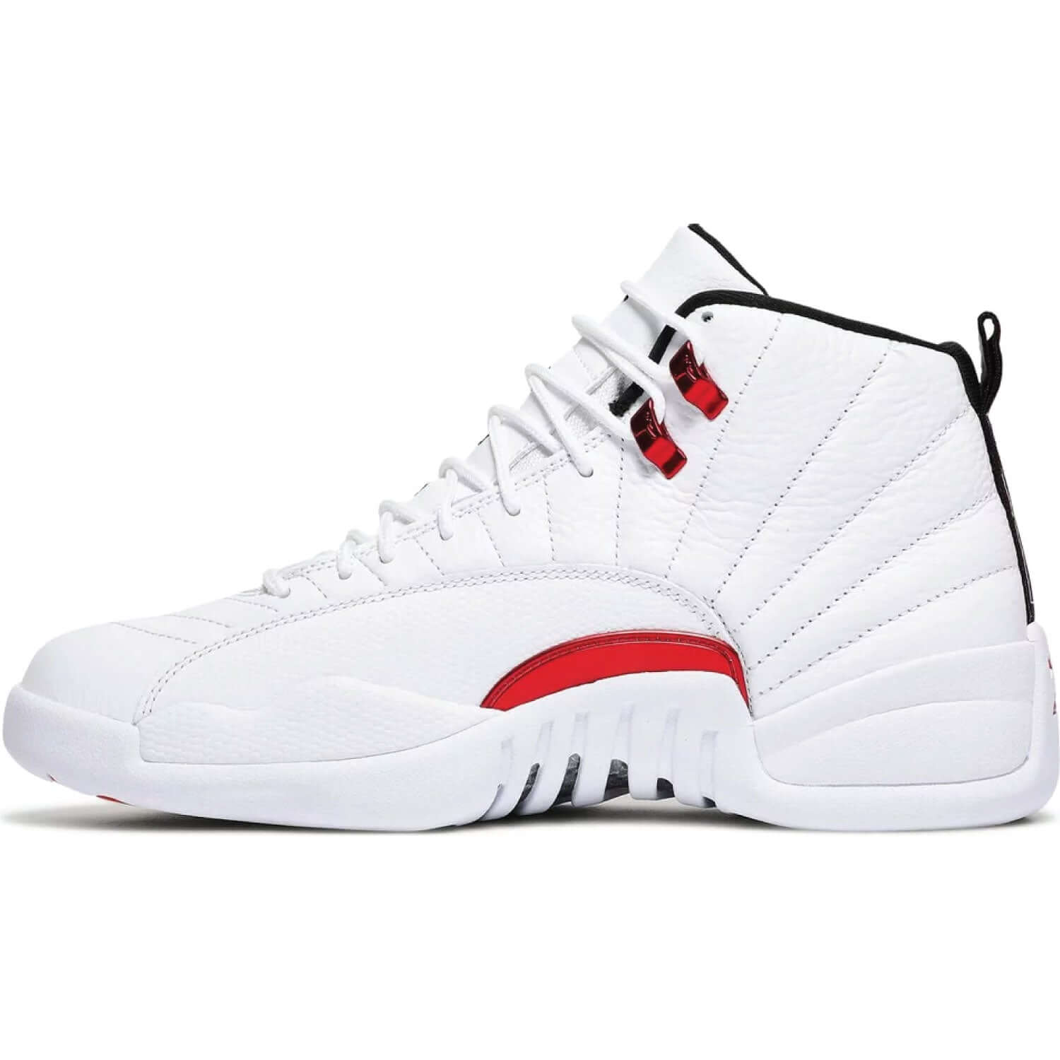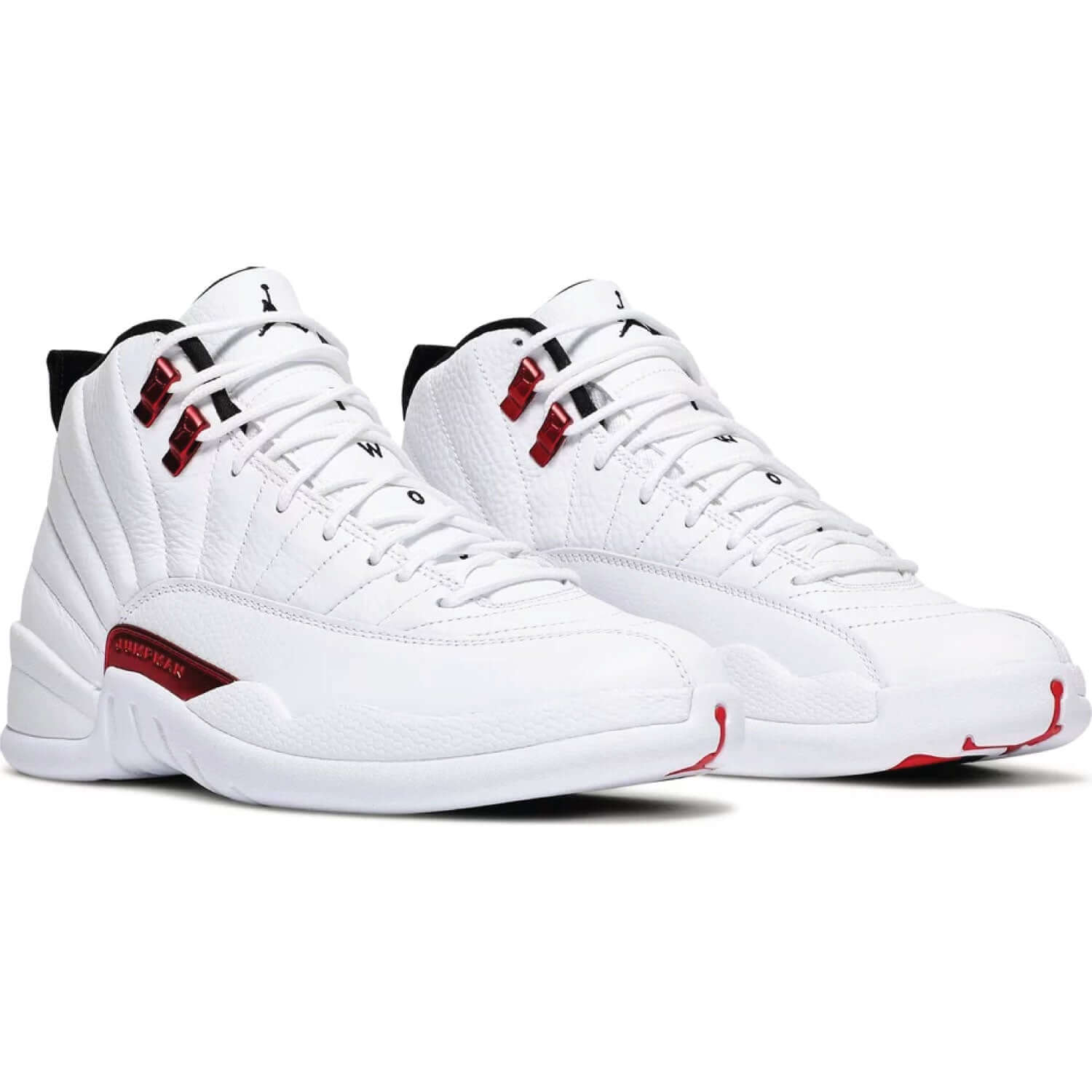 The Air Jordan 12 Retro ‘Twist’ projects a subtle take on the classic Chicago Bulls color palette. A pristine white finish on the stitched tumbled leather upper is matched by the signature lizard-textured mudguard. Sharp crimson accents land on the sneaker’s molded eyelets and a small midfoot overlay stamped with a Jordan wordmark. Contrasting black Jumpman branding decorates the tongue and webbing heel tab. The mid-top rides on a lightweight Phylon midsole with encapsulated full-length Zoom Air.
