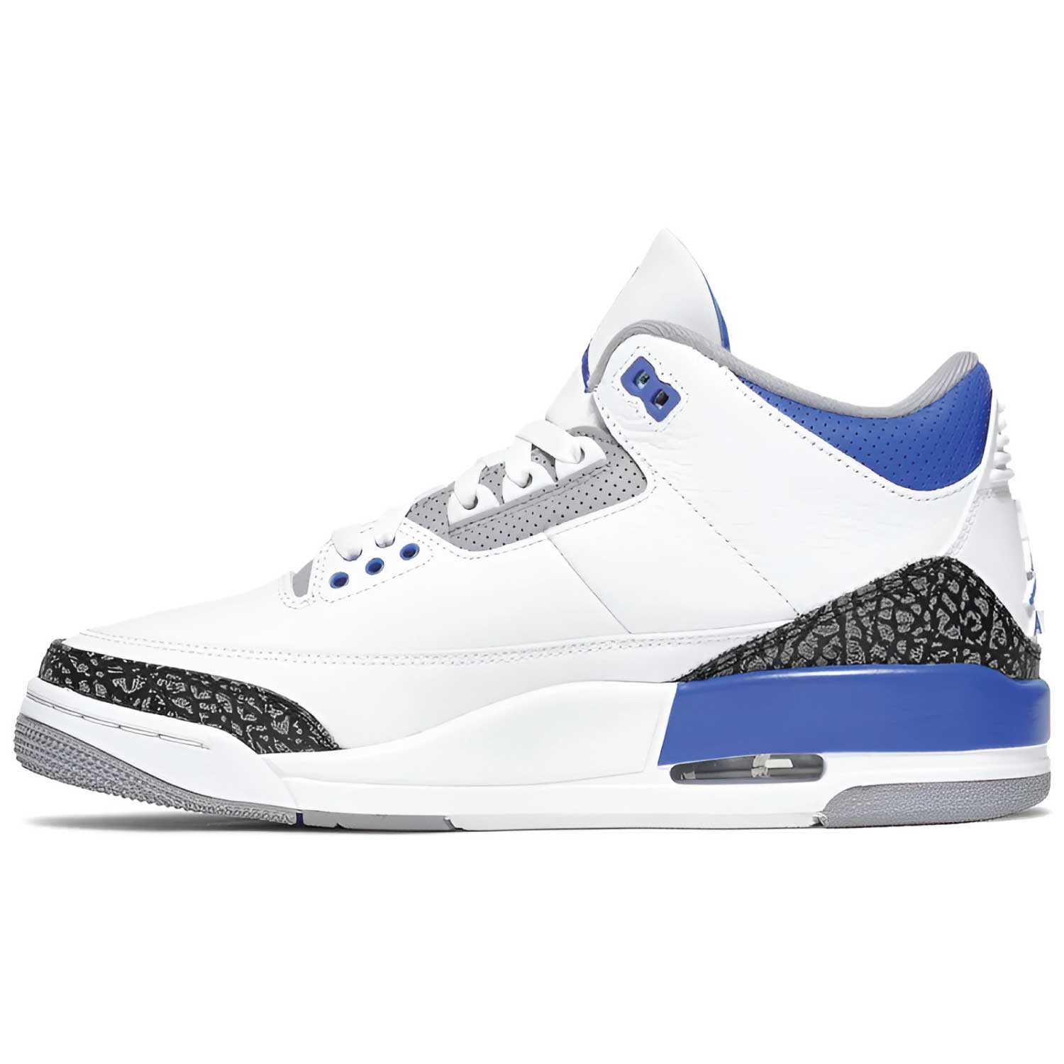 The Air Jordan 3 Retro 'Racer Blue' delivers a fresh update to the iconic silhouette with striking color and texture. Featuring a clean white leather upper paired with vivid Racer Blue accents, this design stands out while honoring Jordan heritage.