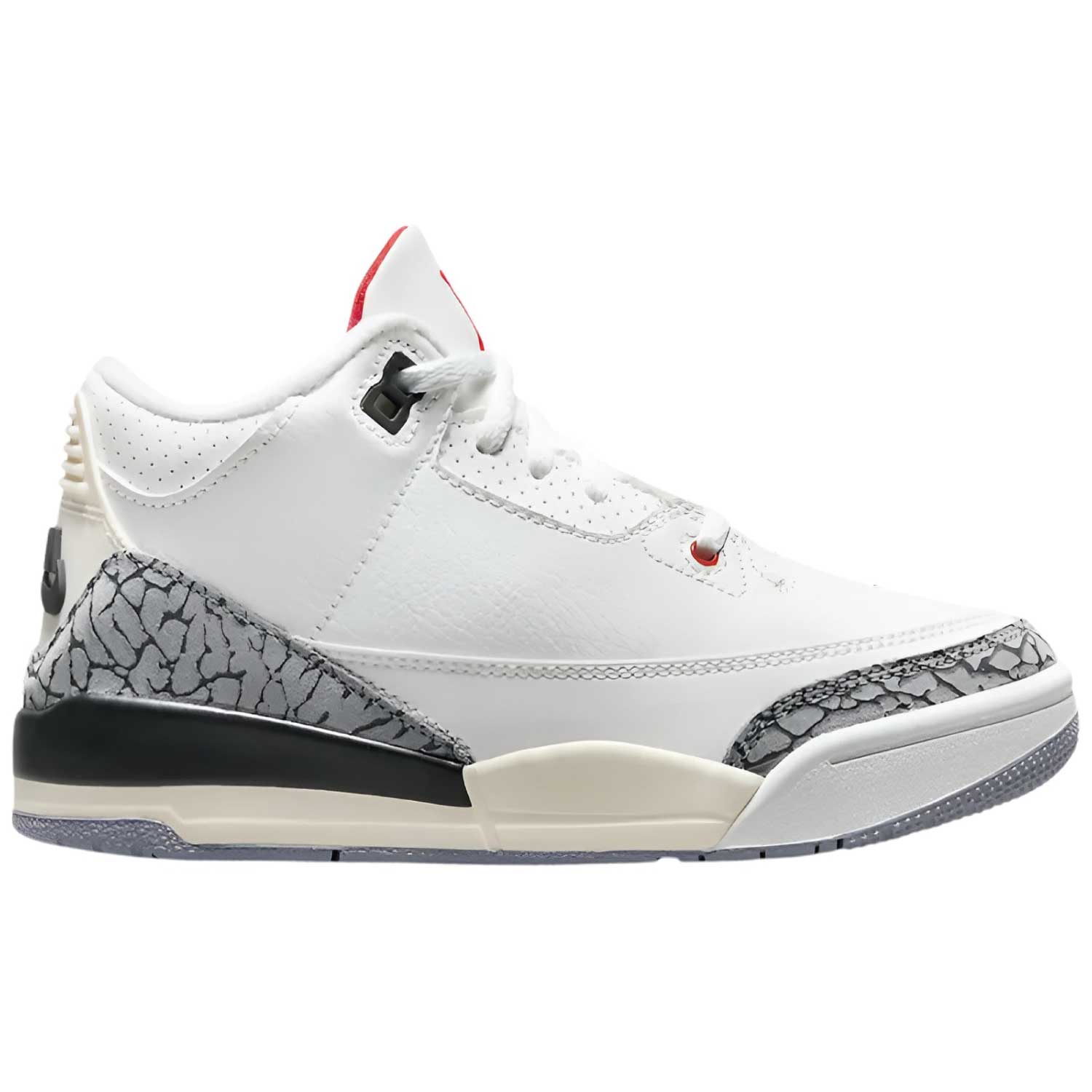 The Air Jordan 3 Retro PS 'White Cement Reimagined' delivers a fresh take on a legendary look, perfectly sized for preschool feet. Featuring a premium white leather upper with iconic Cement Grey Elephant Print overlays, this edition brings timeless style to the next generation. Aged-look midsole and heel tab details add vintage charm, while bold Fire Red accents give it a striking finish.