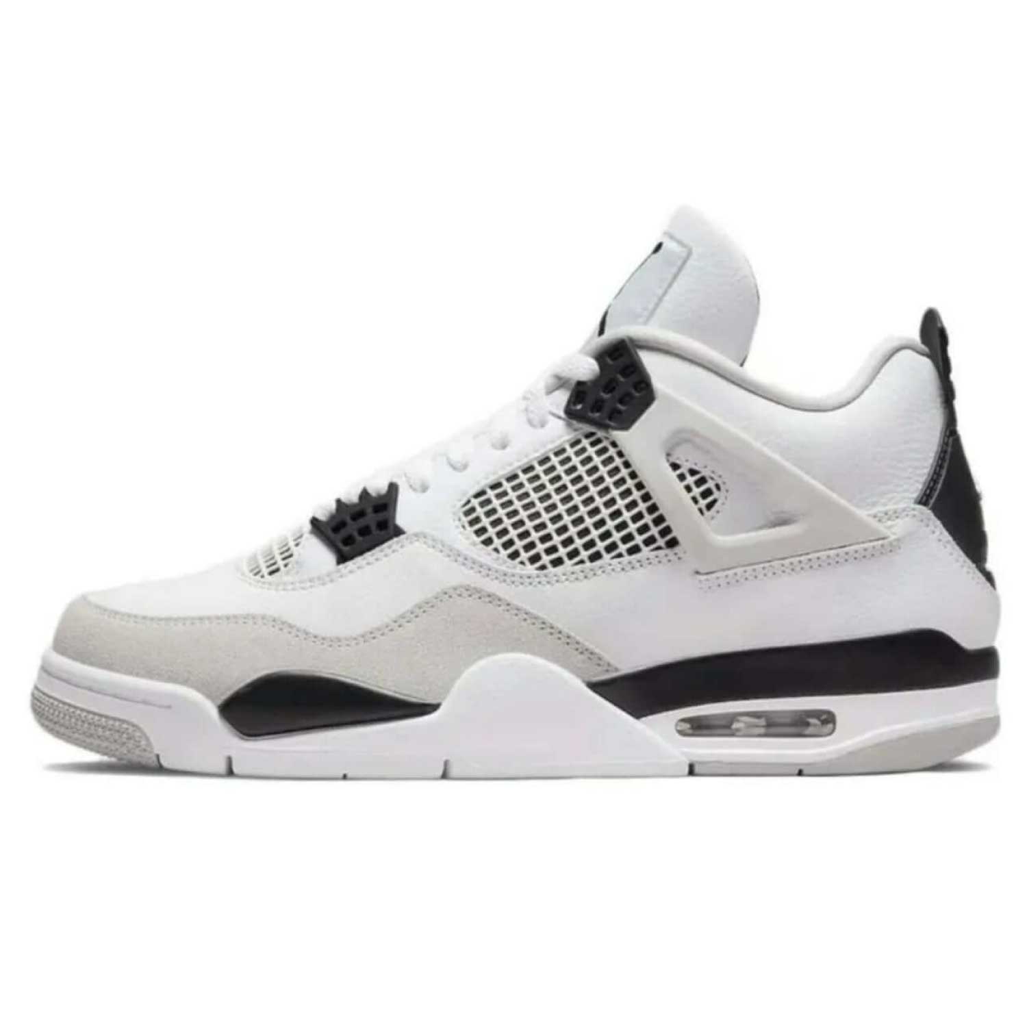 The Air Jordan 4 Retro 'Military Black' is a fresh take on the classic 1989 'Military Blue' colorway, released in 2022. It sports a crisp white leather upper combined with smooth grey suede overlays for a premium feel. Black accents highlight the TPU eyelets, molded heel tab, and the Jumpman logo on the woven tongue tag, adding sharp contrast.