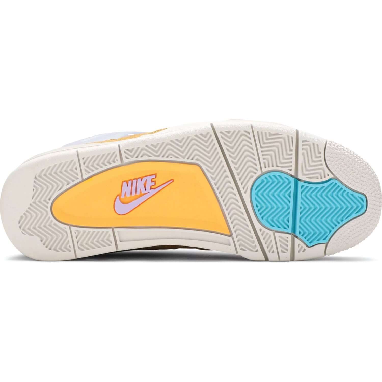 The Air Jordan 4 Retro Union 'Desert Moss' fuses vintage-inspired style with bold, unexpected color. Part of Union LA’s collaboration with Jordan Brand, this edition features a mustard gold suede upper with mesh paneling and vibrant purple and turquoise accents. Signature Union touches like the stitched-down tongue, translucent wings, and aged midsole give it a distinctive, deconstructed aesthetic.