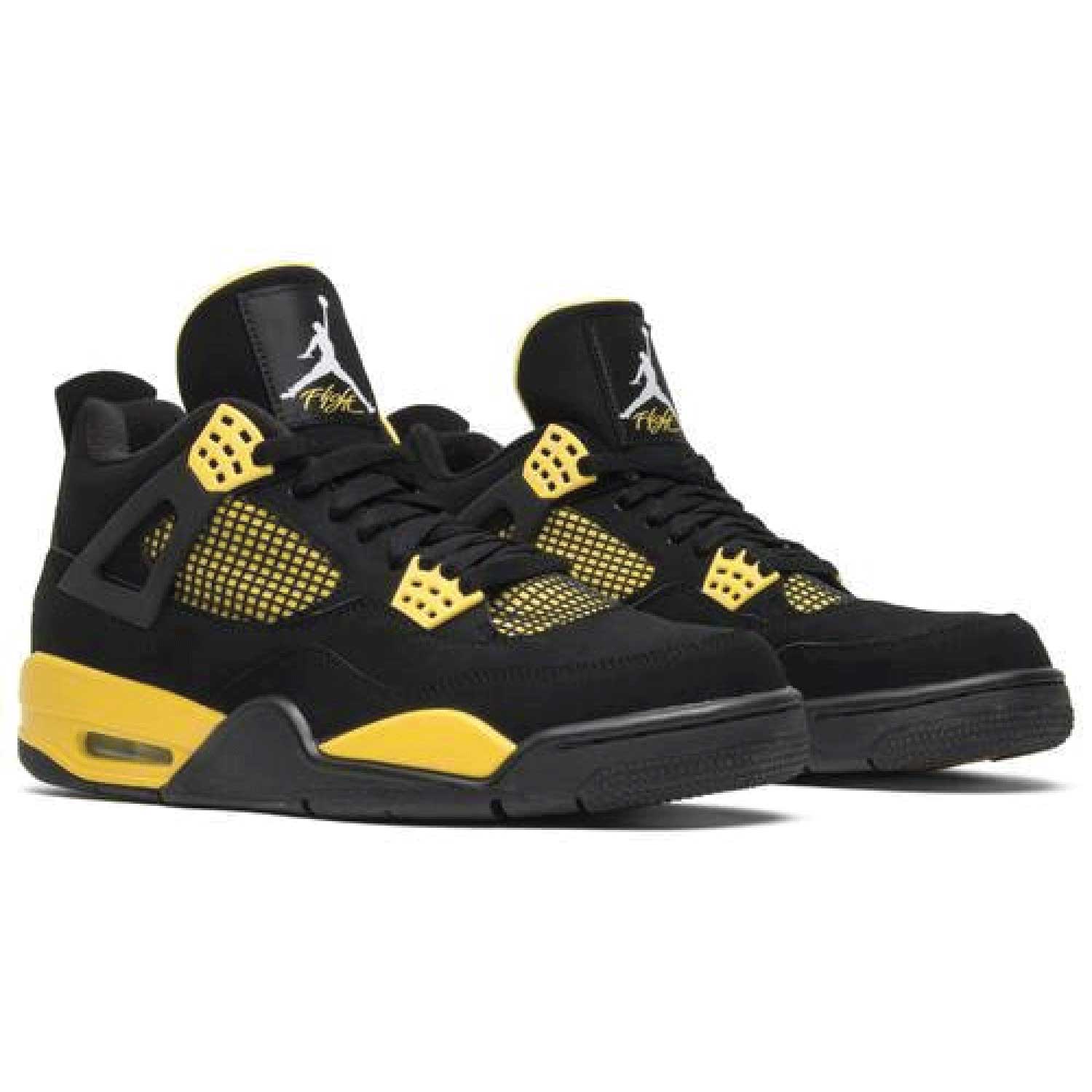 Striking and unforgettable, the Air Jordan 4 Retro 'Yellow Thunder' makes a bold statement with its high-contrast design. Featuring a sleek black nubuck upper paired with electrifying yellow accents on the midsole, eyelets, and mesh backing, this iconic colorway commands attention from every angle. Classic details like the signature wing eyelets, Jumpman branding, and visible Air cushioning stay true to the Jordan legacy, while the bold color palette brings fresh energy to a beloved silhouette.