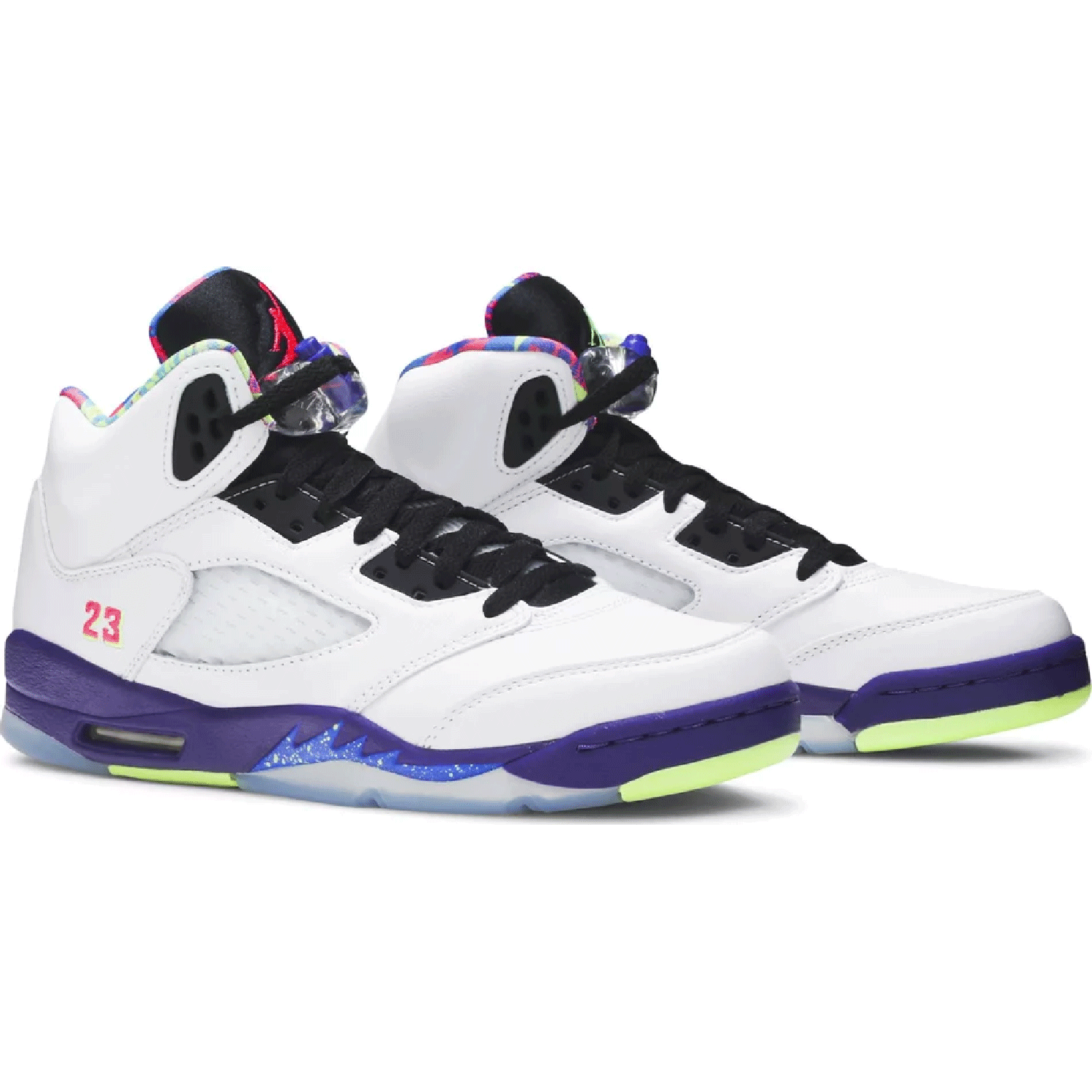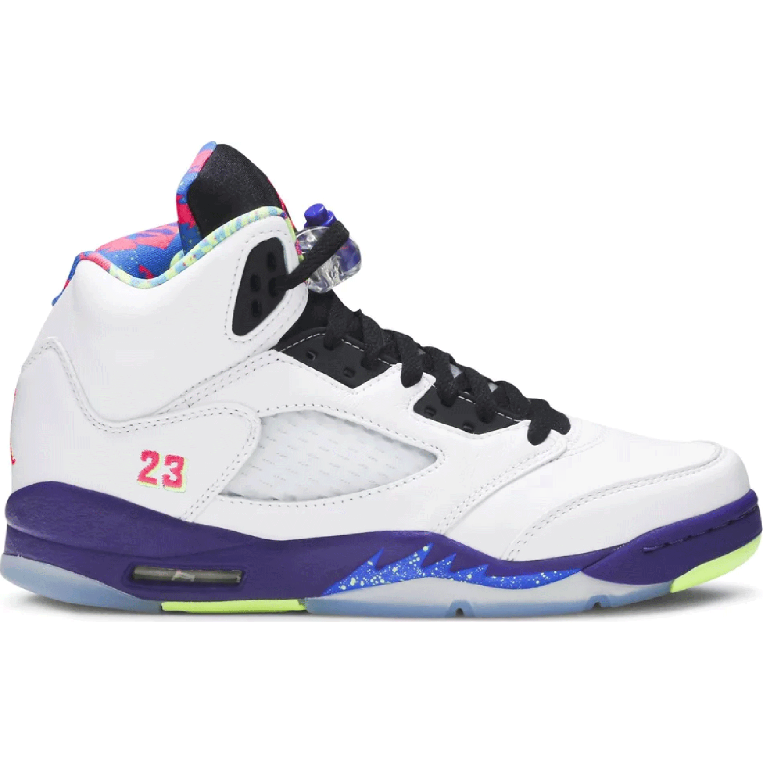Inspired by the vibrant '90s aesthetic of the classic sitcom The Fresh Prince of Bel-Air, the Air Jordan 5 Retro GS 'Alternate Bel-Air' brings bold personality to the iconic silhouette. This grade school edition features a white leather upper contrasted with multicolor accents, including mismatched inner linings and embroidered Jumpman logos.
