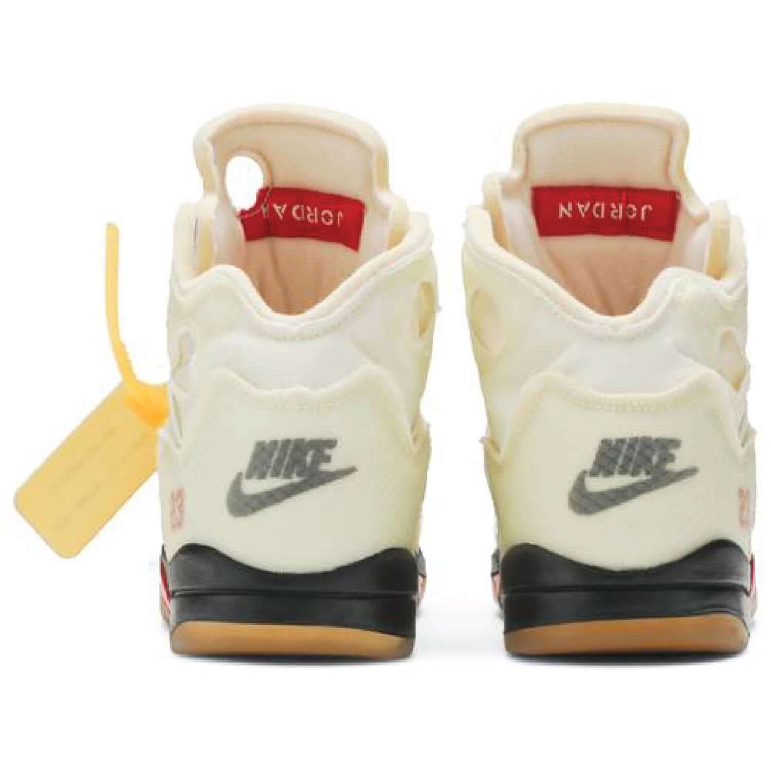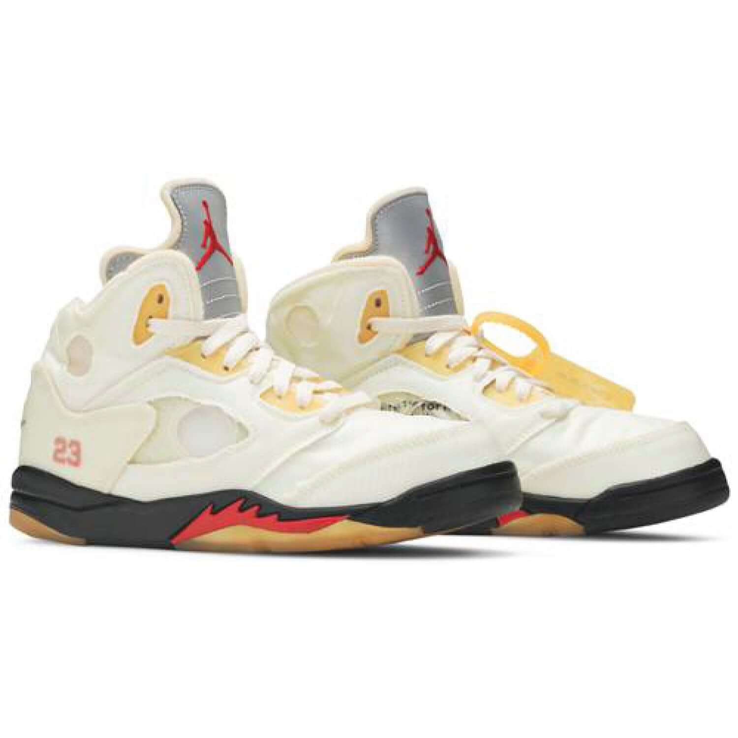The Air Jordan 5 Retro 'Off-White Sail' features a premium sail-colored upper with translucent details and Off-White's signature design elements. The mix of luxe materials, reflective accents, and visible Air cushioning offers both style and comfort in a modern, high-fashion twist on the classic Jordan 5.