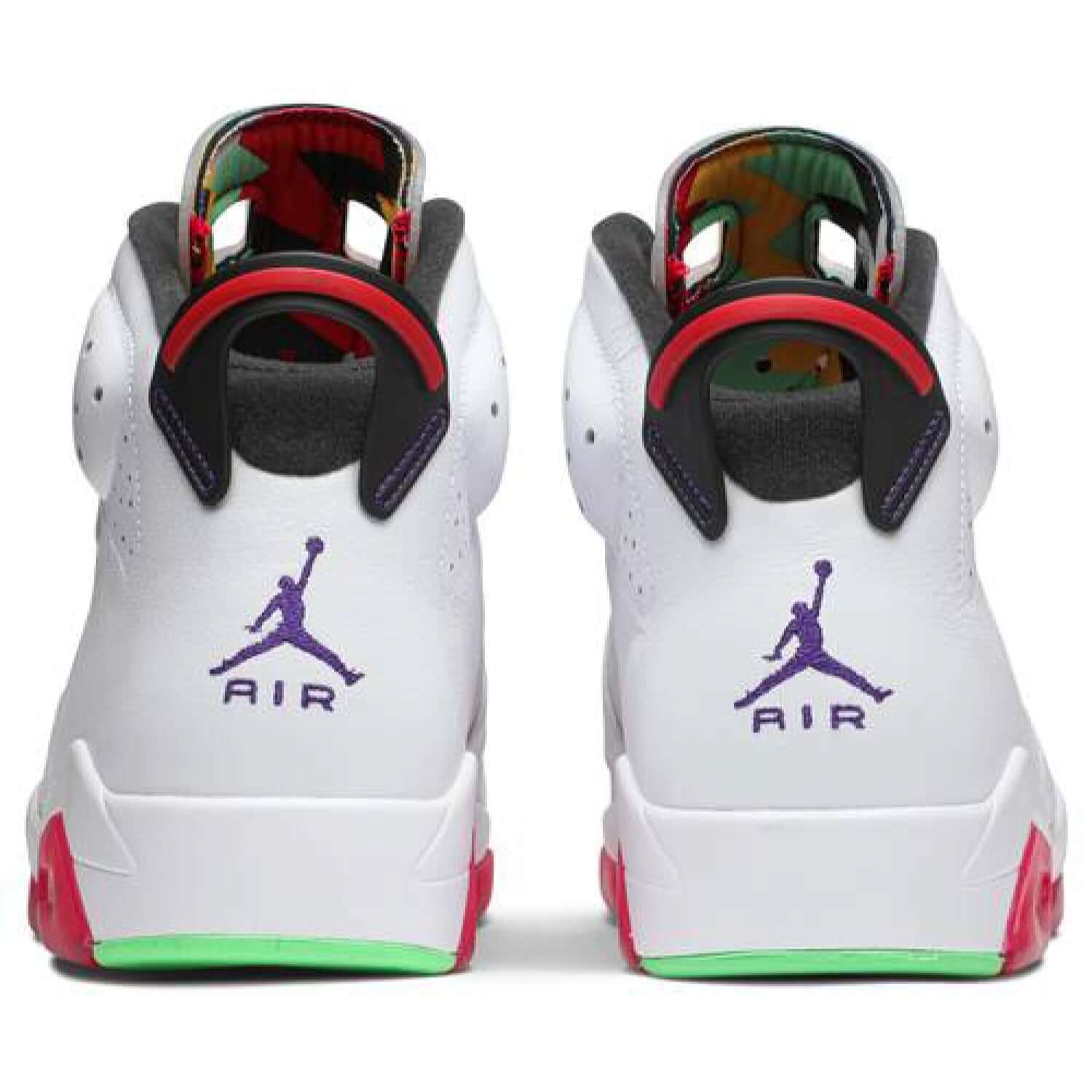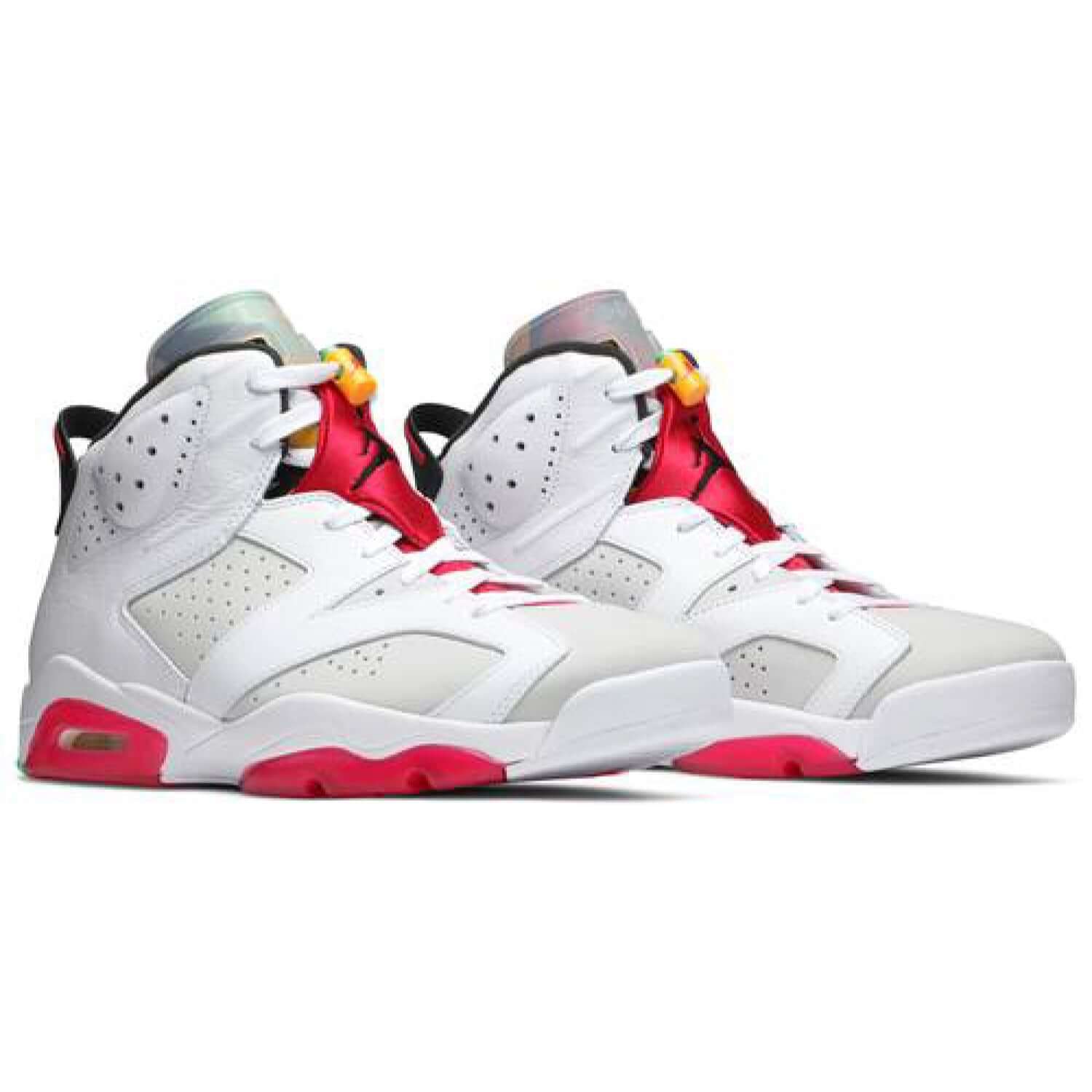 The Air Jordan 6 Retro 'Hare' features a white leather and grey suede upper with vibrant red and green accents, inspired by the classic "Hare" colorway from the Air Jordan 7. This playful design gives a nod to the iconic Bugs Bunny theme, blending fun colors.