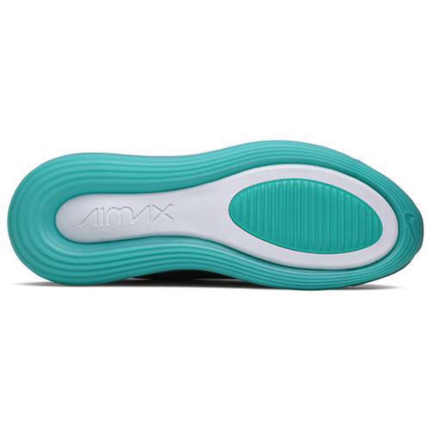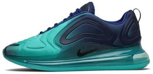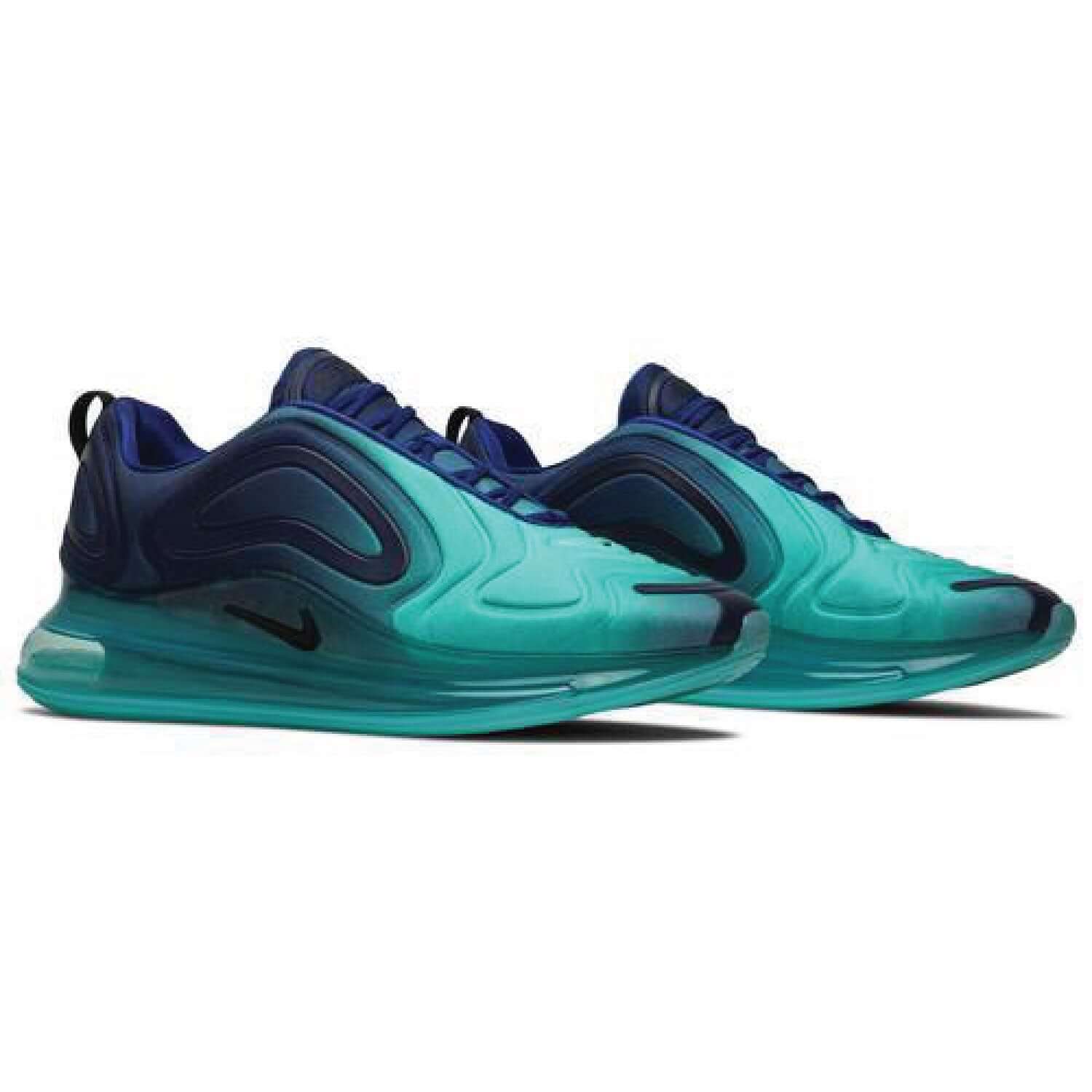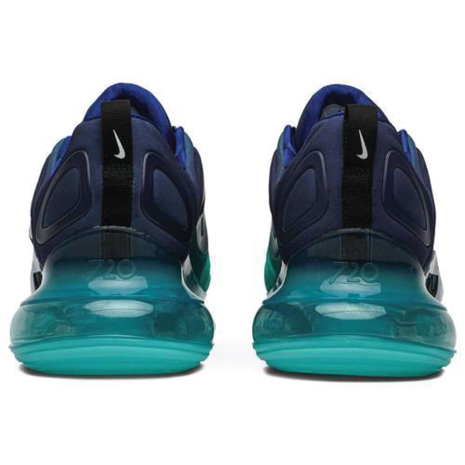 The Air Max 720 ‘Carbon Green’ complements its flowing lines with a gradient colorway that transitions from bright green at the toe to dark blue along the heel. Contrasting hits of black appear on the toe, heel panel and mini-Swoosh at the quarter panel. The sculpted synthetic upper rests atop a massive translucent 720 Air unit, measuring 38 millimeters at its highest point.