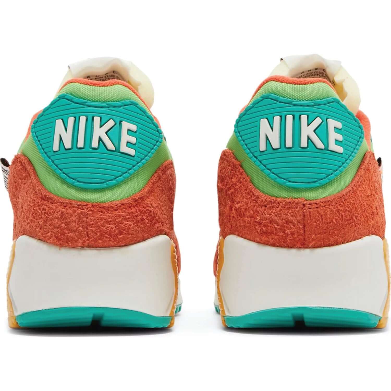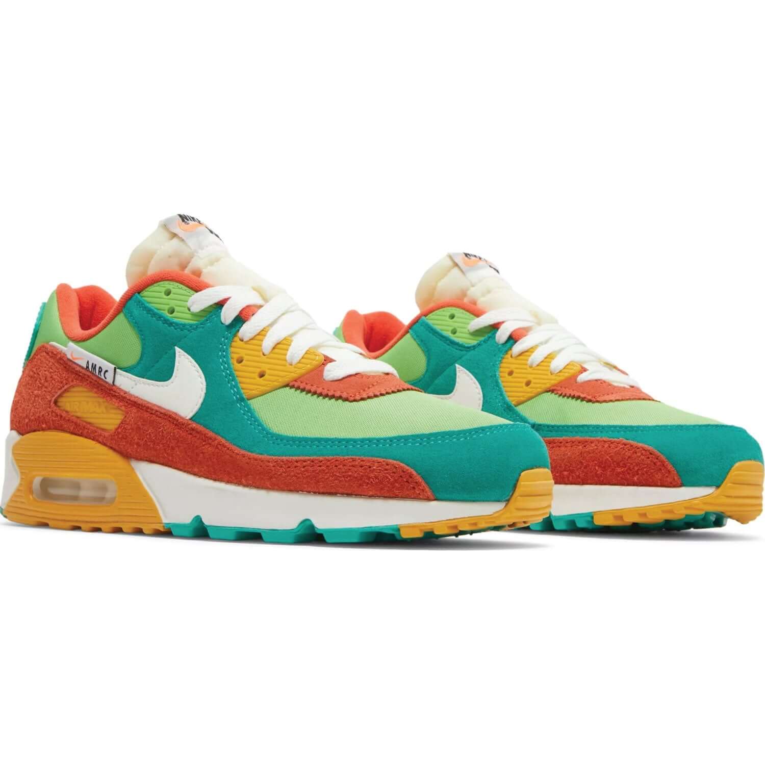 The Air Max 90 SE ‘Roma Green’ is drawn from the ‘Air Max Running Club’ collection, made up of classic silhouettes inspired by West — the legendary running team founded in 1977 by Bill Bowerman, Phil Knight and Geoff Hollister. Like its companion colorways, this pair features a plush exposed foam tongue and mismatched ‘AMRC’ and ‘BVRTN, OR’ tags on the lateral side of each shoe. The upper is constructed from lime green textile with a tonal suede overlay, white leather Swoosh and red suede mudguard. A white polyurethane midsole, fitted with a visible Max Air unit surrounded by an orange midsole wedge, yields lightweight cushioning with each step.