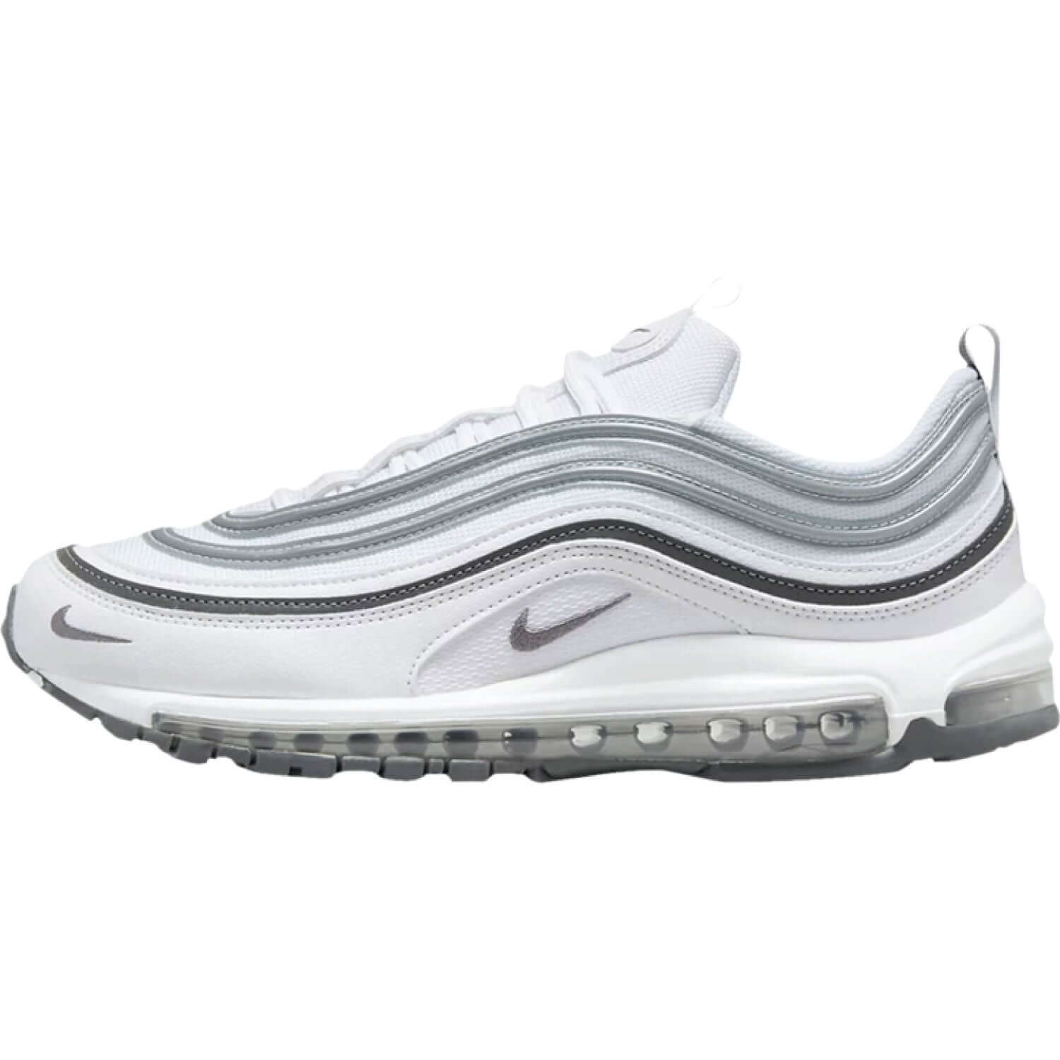 Inspired by the streamlined look of bullet trains, these men's Air Max 97 Ever Sole from bring a fresh look to the '97 OG. In a White, Metallic Dark Grey and Metallic Silver colourway, these retro-inspired runners have a leather and textile upper with wavy overlays. They keep the classic Invisible lacing system, which locks you in, while a woven heel pull offers easy on and off. Sat on a lightweight midsole, these sneakers ride high on full-length, visible Air cushioning, which brings supreme comfort. They have a grippy, waffle-inspired tread and are finished up with mini Swoosh branding.