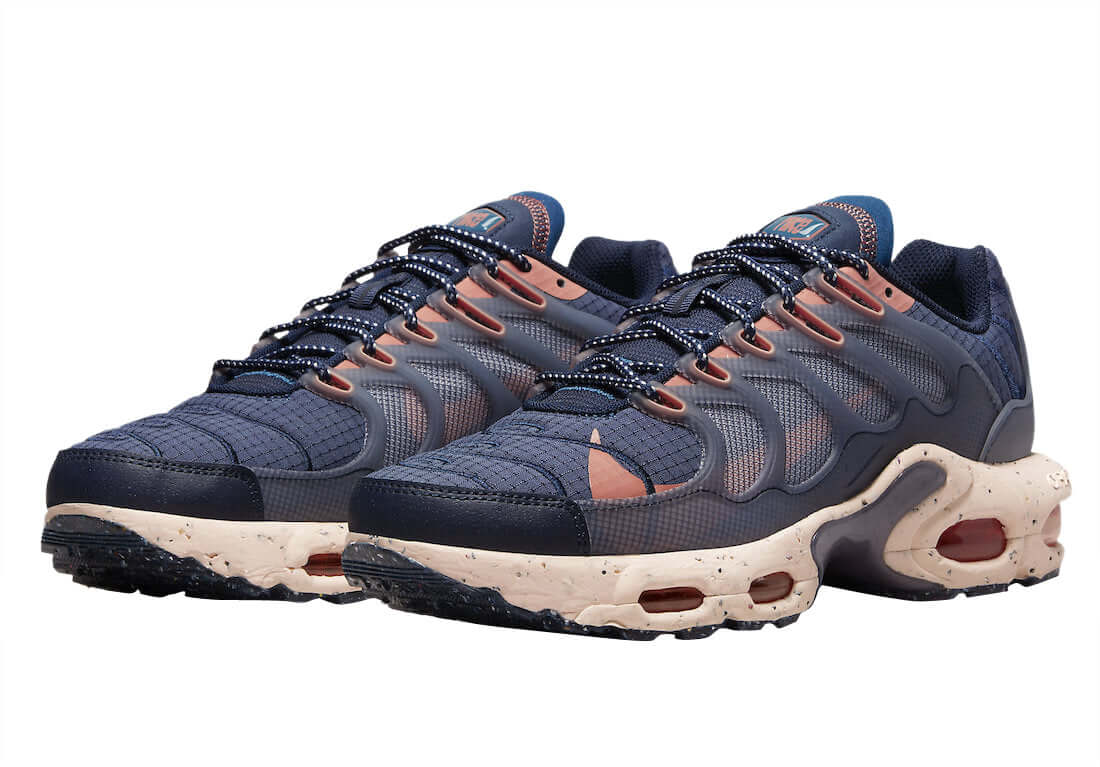The Air Max Terrascape Plus 'Navy Pink' is imbued with forward-thinking innovation for a street lifestyle. Introduced in April 2019, this 'Navy Pink' edition mimics movement with a radiating wave pattern molded into the mesh upper. Tonal laces, synthetic frames and a pull tab amplify the look. A Swoosh-branded mudguard and a bulging, translucent Air unit deliver a sleek, cushy base.
