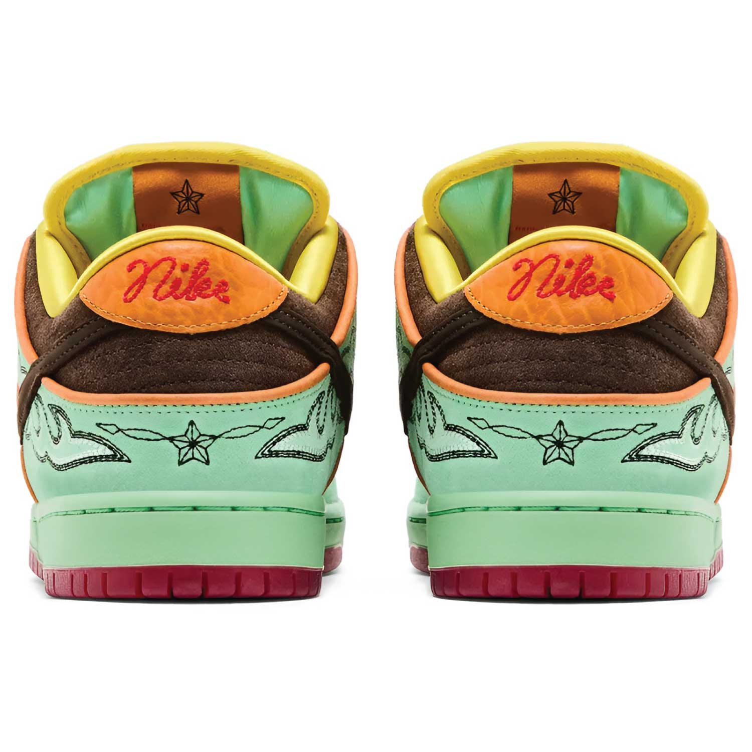 The Dunk Low SB 'Rodeo' is a bold tribute to Western heritage, blending rugged textures with vibrant accents. Featuring a tourmaline green suede upper, baroque brown overlays, and monarch orange highlights, this sneaker captures the spirit of the rodeo