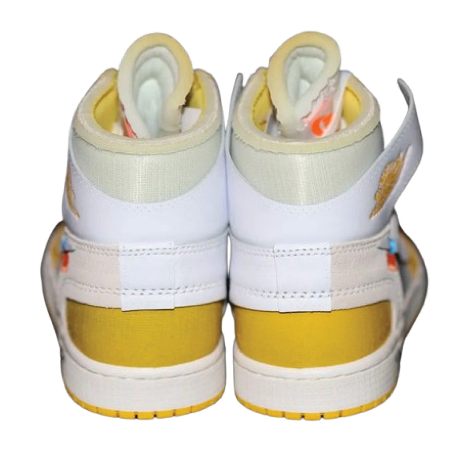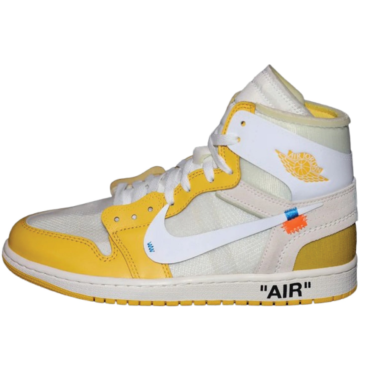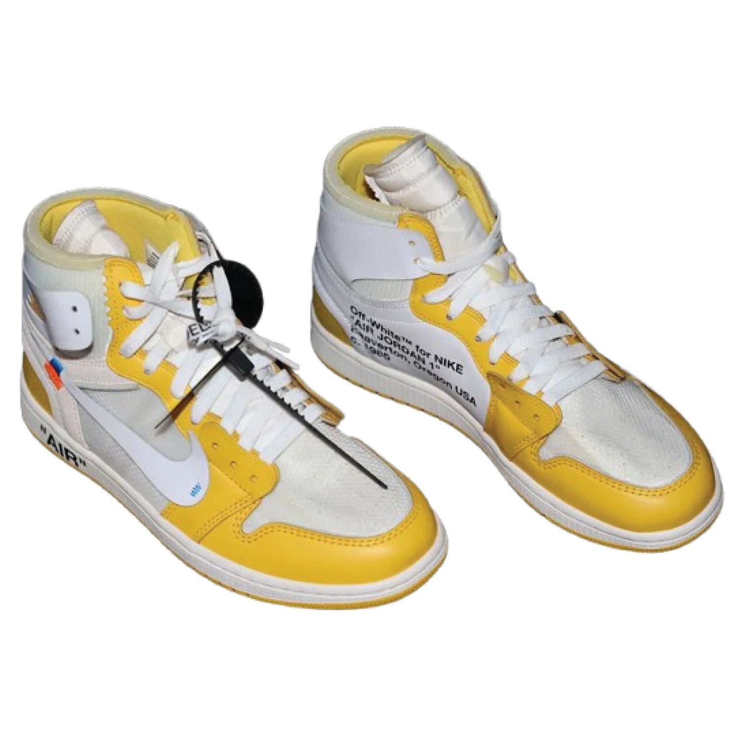 The Off-White x Air Jordan 1 Retro High OG 'Canary Yellow' is a vibrant collaboration between Virgil Abloh and Jordan Brand, featuring a deconstructed design with a white and yellow leather upper, signature Off-White text, and a black zip tie.