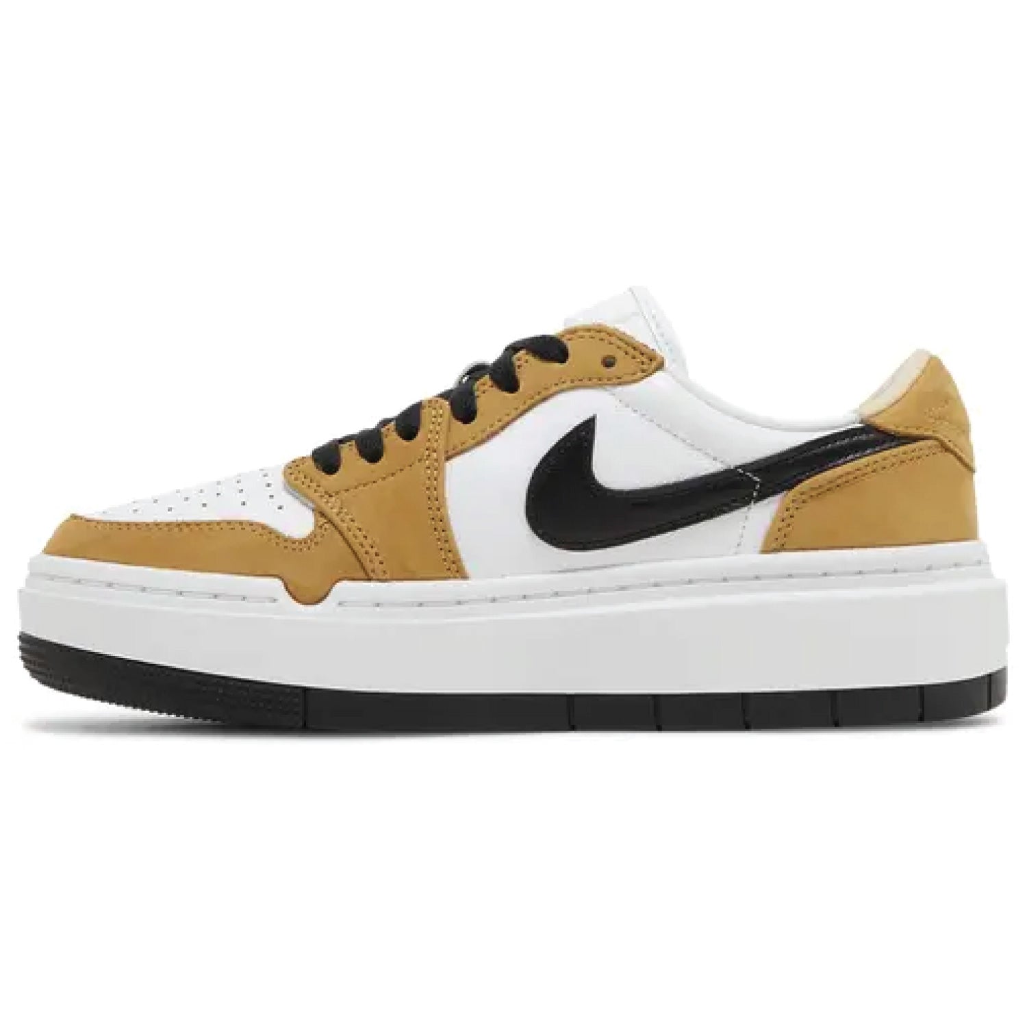 A bold reinterpretation of a legendary moment, the Women’s Air Jordan 1 Elevate Low ‘Rookie of the Year’ pays tribute to Michael Jordan’s iconic 1985 accolade with elevated style. Featuring a platform sole and a sleek low-top profile, this women's blends the classic golden brown and white colorway with modern design elements.