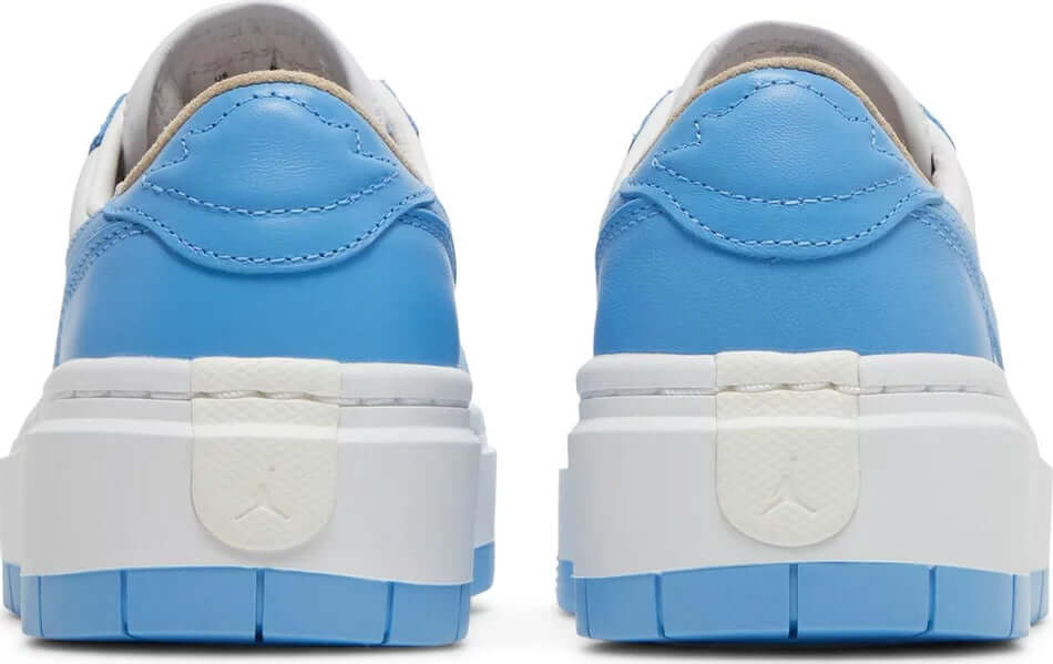 The Wmns Air Jordan 1 Low Elevate 'University Blue' features a clean white leather upper with soft University Blue accents, elevated by a thick platform sole. This stylish sneaker combines classic Jordan elements with a modern, elevated look.