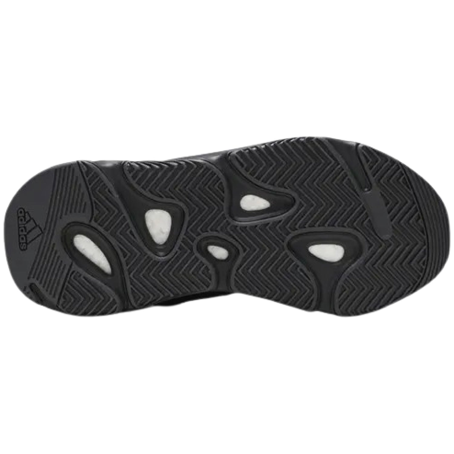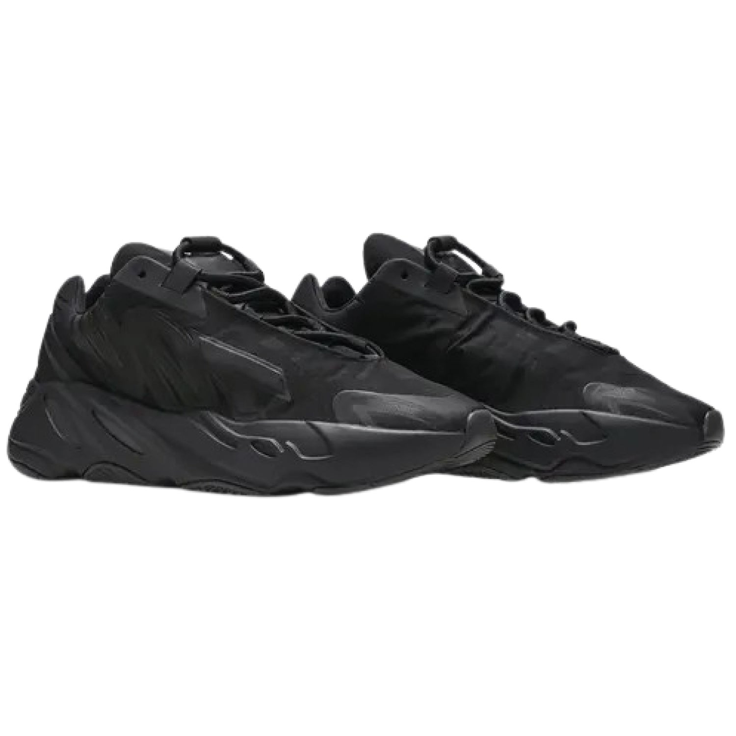 The Yeezy Boost 700 MNVN 'Triple Black' is a sleek iteration of Kanye West's iconic chunky sneaker, released in February 2020. It features a triple-black nylon upper with heat-welded panels and a prominent 3M reflective '700' graphic on the lateral side. The design includes a bungee lace system for a streamlined look, complemented by a full-length Boost midsole encased in a sculpted foam shell, ensuring exceptional comfort. A rubber outsole provides reliable traction.