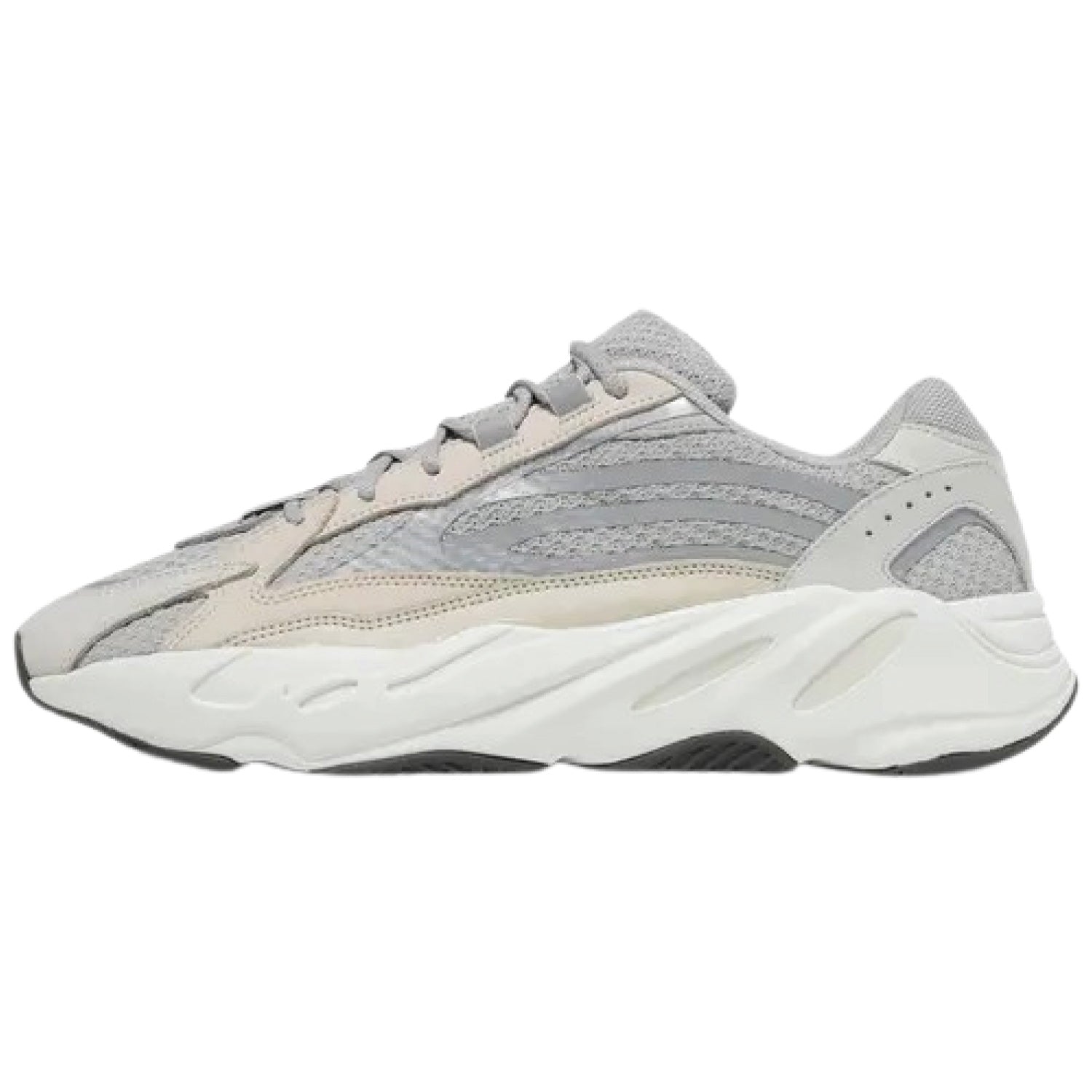 The Yeezy Boost 700 V2 'Cream' features a layered design that blends futuristic style with everyday comfort. Its upper is constructed with breathable mesh underlays, premium leather overlays, and reflective accents for added depth and visibility. The neutral cream and grey tones offer a versatile, minimalist aesthetic. Underfoot, the sculpted Boost-infused midsole provides responsive cushioning, while the rubber outsole ensures durable traction. Sleek, supportive, and effortlessly wearable, this colorway brings modern sophistication to the classic Yeezy 700 silhouette.